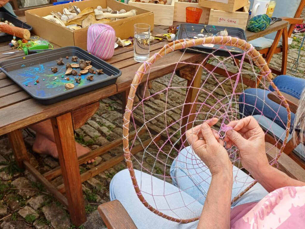 Mein Name ist Helga Geiler, ich bin die “Werkzeugmacherin” im Verein. Immer wieder darf ich im privatem Rahmen Workshops anleiten, in denen das Tun mit den Naturmaterialien im Vordergrund steht: sei es Freundinnen, die gemeinsam zusammensitzen und ihren Traumfänger bei mir fertigen, oder zwei Schwestern, die sich im Rahmen ihrer Ausbildung bei mir eine Ritualrassel fertigen,. mit all den Dingen aus der Natur, die sie ansprechen.